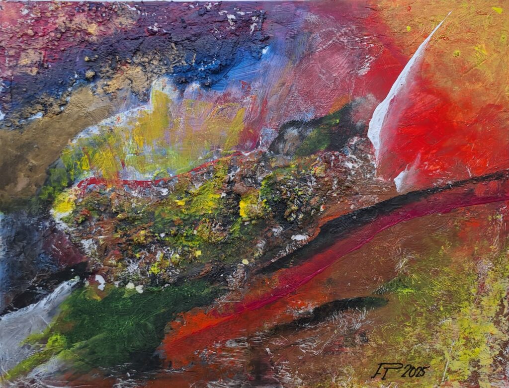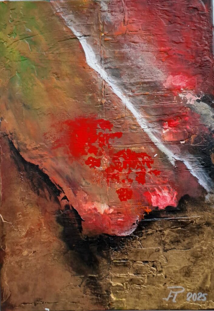 Bilder ankliken für eine vergrößerte Ansicht Titel: Farbexplosion – Abstrakte Energie in Bewegung 50*50 cm: kräftige Strucktur, Acryl auf Leinwand-. „Spiegel der Seele“ 120*90 cm: Acryl-Struktur auf Leinwand „Explosion der Farben“ 40*40 cm: Oelfarbe auf Leinwand „Kollaps – Farbe im Fluss“ 50*50 cm: Oelfarbe auf Leinwand „Landschaft im Herzen“ 80*60 cm: Acryl auf Leinwand mit metallic Effekten „Fragment der Zeit“ 50*50 cm: Acryl mit Rostbrauner-Strucktur auf Leinwand Signiert: 2025 „Erde und Feuer“ – 120*90 cm: Acryl auf Leinwand, ausdrucksstarke Strucktur, Signiert 2025 Land und Feuer 70*50 cm: Acryl auf Leinwand, Ausdrucksstarke Strucktur, Signiert 2025 Feuerkern 80*50 cm: Acryl auf Leinwand, Ausdrucksstarke S-trucktur, Signiert 2025 Moderne Welt 70*50 cm: Acryl auf Leinwand, Ausdrucksstarke Strucktur, Signiert 2025 Ibiza 80*60 cm: Oelfarbe, pastös auf Leinwand, Ausdrucksstarke Strucktur in Oel, Signiert 2025 Mann im Bambuswald 80*60 cm: Oelfarbe, pastös auf Leinwand, Ausdrucksstarke Strucktur in Oel, Signiert 2025 Seerosenteich 120*90 cm: Seerosen nach Monet, Acryl auf Leinwand Citylight 50*50 cm: Acryl auf Leinwand Frau in Bewegung 120*90 cm: Oel auf Leinwand von 2025 Wasser am Rand der Welt 120*90 cm: Oel auf Leinwand